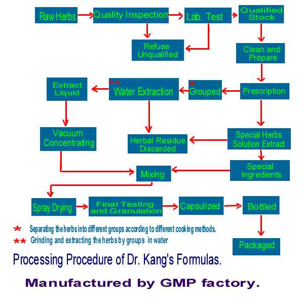 This is the processing procedure of Dr. Kang's Formulas. The raw herbs used in these formulas, are selected by herbalists directly from the farms of 15 plots all over China, which warrantee the right species, best-quality and chemical-free herbs to be used for these formulas.